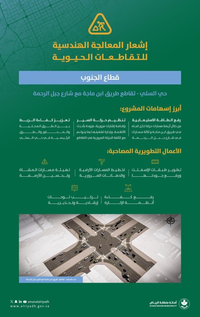 وتأتي هذه المعالجة ضمن أعمال تطوير عدد من التقاطعات هندسيًا في مدينة الرياض، الذي يعتمد على حلول هندسية تسهم في تخفيف الازدحام المروري ورفع كفاءة شبكة الطرق داخل الأحياء، بما يواكب النمو العمراني ويعزز كفاءة البنية التحتية للنقل في العاصمة.