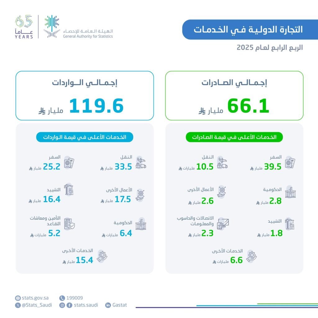 عرض الكل” الإحصاء”: (66.1) مليار ريال قيمة صادرات الخدمات في الربع الرابع من عام 2025م