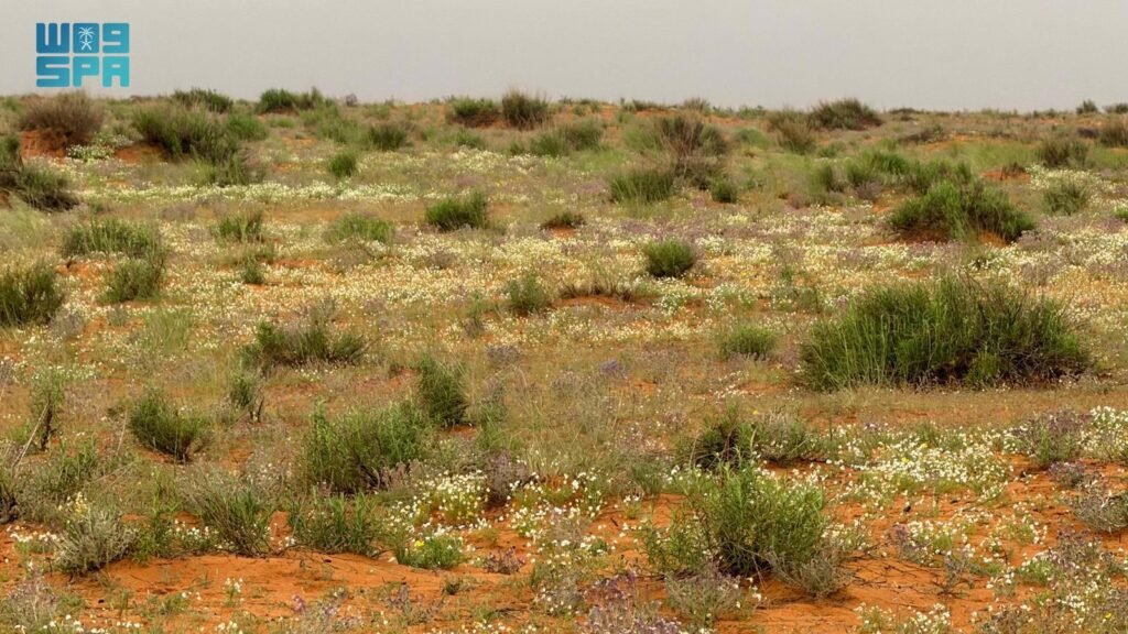 كما انتشرت الأزهار البرية بألوانها المتنوعة، متداخلة مع الأعشاب والشجيرات الصحراوية على مد النظر، لتضفي على المنطقة الرملية لوحة طبيعية نابضة بالحياة، وسط أجواء ربيعية معتدلة.