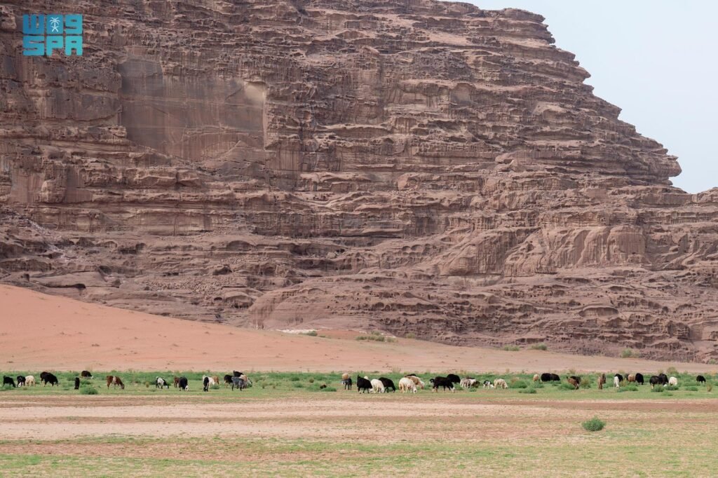 وتتنوع النباتات البرية التي ظهرت خلال هذا الموسم ما بين الحشائش الموسمية والزهور البرية التي أضفت ألوانًا زاهية على امتداد الفيافي، حيث امتدت مساحات الخضرة على نحو لافت بين التكوينات الصخرية والكثبان الرملية، في لوحة طبيعية تعكس تداخل العناصر البيئية وتوازنها.