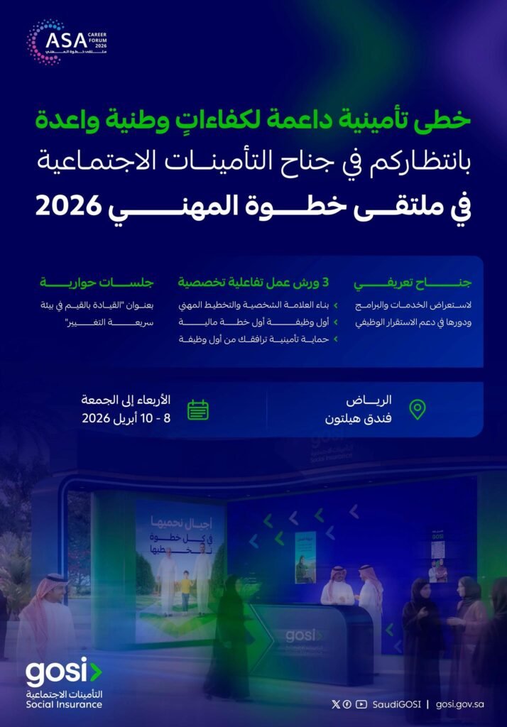 تشارك المؤسسة العامة للتأمينات الاجتماعية كراعٍ إستراتيجي في ملتقى خطوة المهني 2026، الذي يقام في العاصمة الرياض خلال الفترة من 8 إلى 10 أبريل الجاري، وذلك بهدف تعزيز التواصل بين التأمينات وفئة الشباب؛ لرفع وعيهم بالأنظمة والمنافع التأمينية، وتعريفهم بخدمات وبرامج المؤسسة التي تدعم الاستقرار الوظيفي.