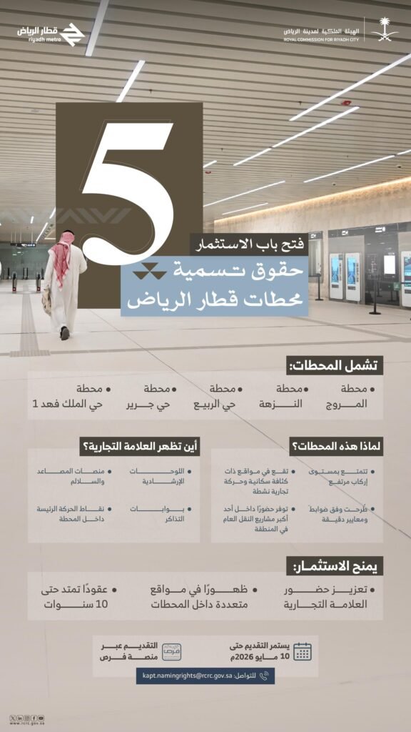 عرض الكلالهيئة الملكية لمدينة الرياض تفتح باب الاستثمار في حقوق تسمية خمس محطات لقطار الرياض