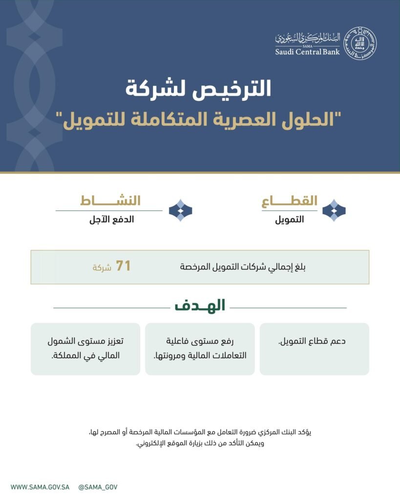 البنك المركزي السعودي يرخص لشركة “الحلول العصرية المتكاملة للتمويل” لمزاولة نشاط الدفع الآجل