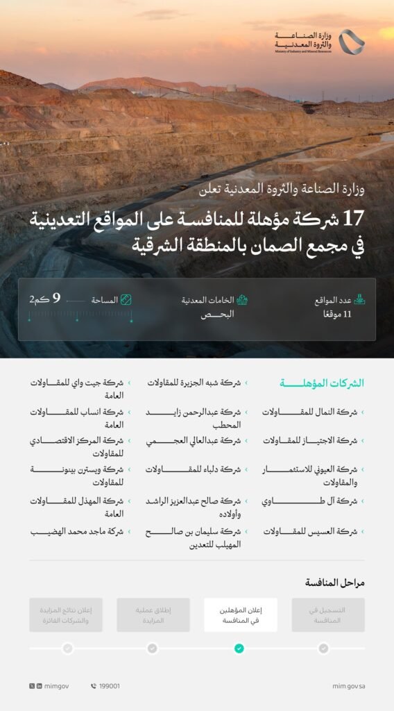 عرض الكلوزارة الصناعة والثروة المعدنية تعلن تأهل 17 شركة محلية للمنافسة على 11 موقعًا تعدينيًّا في مجمع كسّارات الصمان