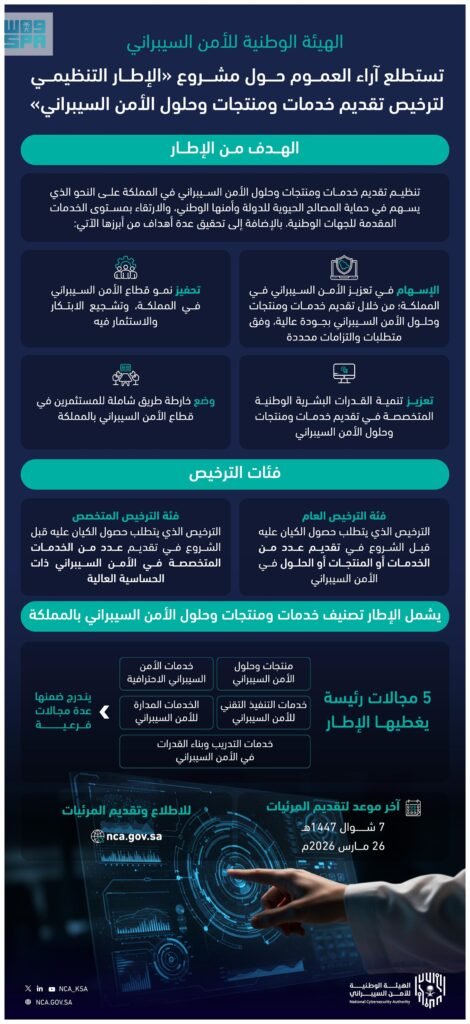 وحثت الهيئة جميع الجهات ذات العلاقة والعموم على إبداء المرئيات حول وثيقة مشروع “الإطار التنظيمي لترخيص تقديم خدمات ومنتجات وحلول الأمن السيبراني”، وحددت يوم الخميس 7 شوال 1447هـ الموافق 26 مارس 2026م آخر موعد لتلقي المرئيات، وذلك من خلال المنصة الإلكترونية الموحدة لاستطلاع آراء العموم “استطلاع” أو من خلال تعبئة نموذج تقديم المرئيات المتاح في الموقع الإلكتروني للهيئة وإرساله إلى البريد الإلكتروني: info@nca.gov.sa, كما يمكن الحصول على نسخة من الوثيقة وتقديم المرئيات بشأنها من خلال الموقع الإلكتروني للهيئة.