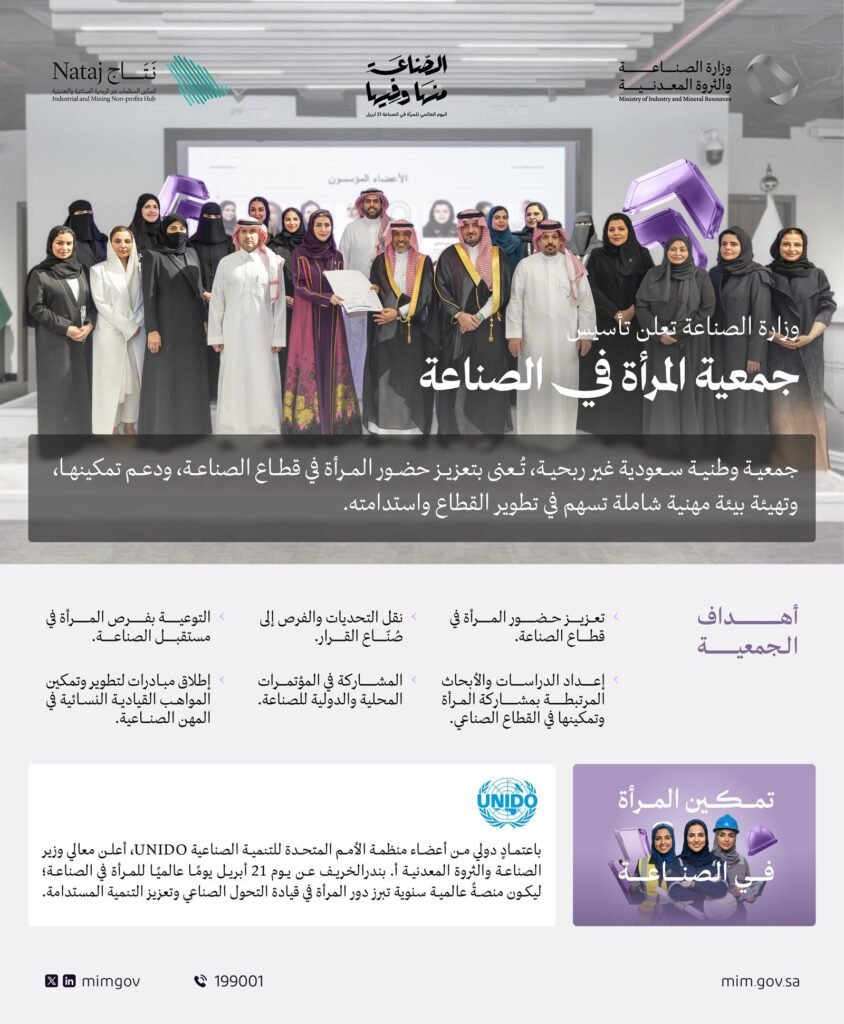 يذكر أن تأسيس جمعية المرأة في الصناعة غير الربحية، يأتي ضمن جهود وزارة الصناعة والثروة المعدنية؛ لتمكين القطاع غير الربحي، وتعزيز دوره في مجالات الصناعة والتعدين، وزيادة إسهامه وأثره المباشر في إجمالي الناتج المحلي للاقتصاد الوطني، وفقًا لمستهدفات رؤية المملكة 2030.