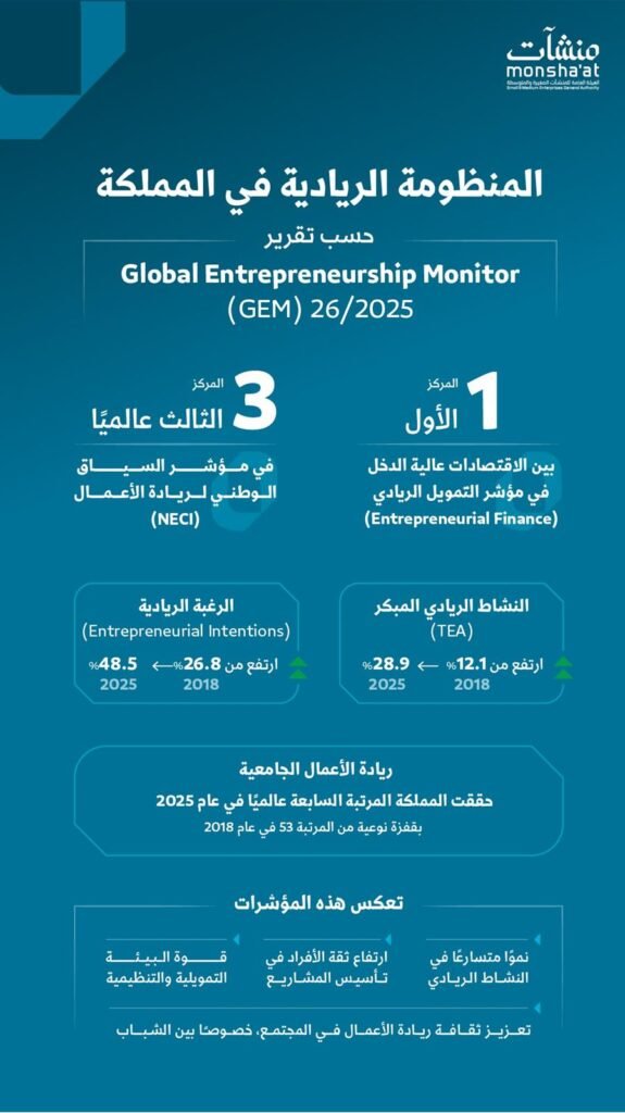 وتصدّرت المملكة الاقتصادات عالية الدخل عالميًا في مؤشر التمويل الريادي (Entrepreneurial Finance) لعام 2025، في تأكيد على كفاءة البيئة التمويلية وتطور أدوات دعم المنشآت الصغيرة والمتوسطة، بما يسهم في تسهيل وصولها إلى مصادر التمويل وتعزيز نموها واستدامتها؛ كما حققت المملكة المركز الثالث عالميًا في مؤشر السياق الوطني لريادة الأعمال (NECI)، ما يضعها ضمن الاقتصادات الأكثر تقدمًا في تهيئة البيئة الممكنة لريادة الأعمال، ويعزز مكانتها كوجهة جاذبة للاستثمار الريادي على مستوى العالم.