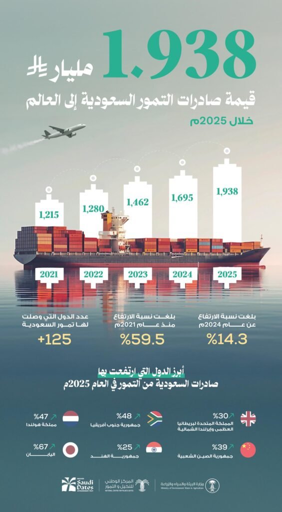 المملكة تحقق نموًّا قياسيًا في قيمة صادرات التمور السعودية بنحو ملياري ريال وتُعزّز سيطرتها على أسواق التمور العالمية