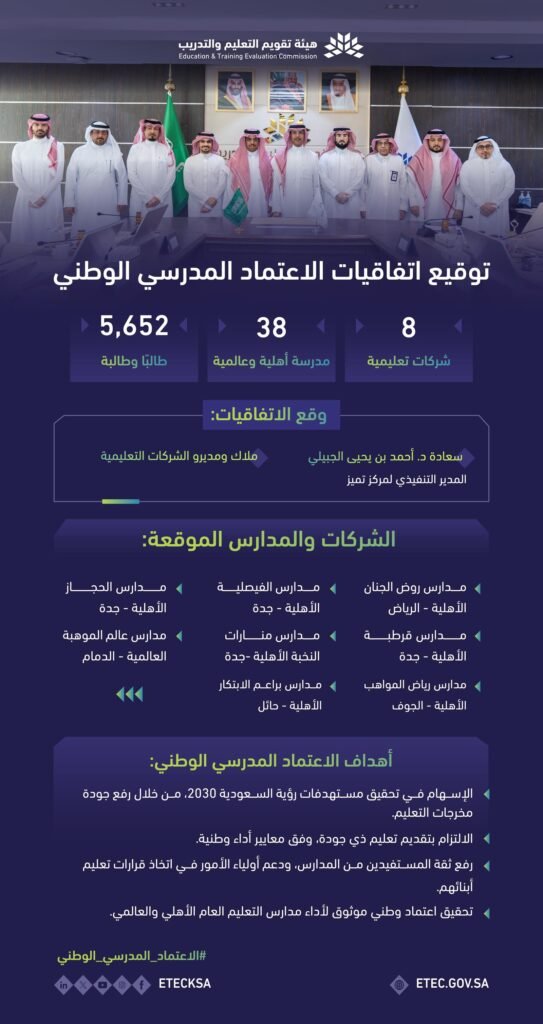 وقّعت هيئة تقويم التعليم والتدريب، ممثلة بالمركز الوطني للتقويم والتميز المدرسي تميز، اتفاقيات الاعتماد المدرسي الوطني مع (8) شركات تعليمية، تضم (38) مدرسة أهلية وعالمية، و(5,652) طالبًا وطالبة، وذلك في مقر الهيئة بمدينة الرياض.