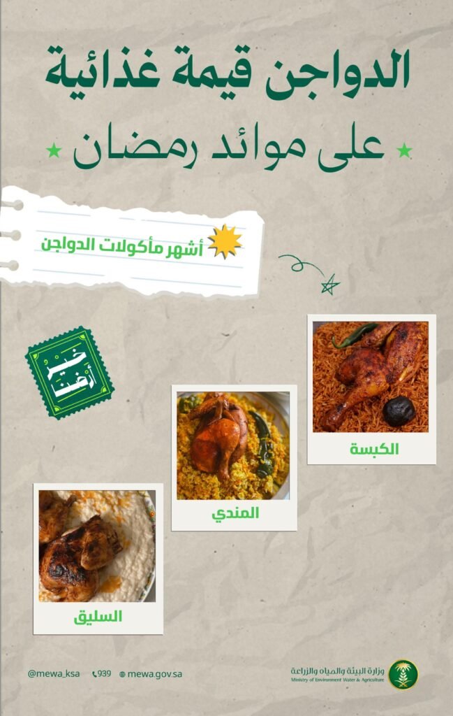 وأوضحت وزارة البيئة والمياه والزراعة، ضمن حملة “خير أرضنا” التي أطلقتها بهدف تشجيع استهلاك المنتجات الغذائية المحلية خلال شهر رمضان, أن لحوم الدواجن تتميز بقيمة غذائية عالية، كونها مصدر غني بالبروتينات والفيتامينات والمعادن الأساسية، إلى جانب سهولة تحضيرها وتنوع استخدامها في الوجبات الرمضانية؛ مما يجعلها خيارًا غذائيًا مناسبًا لمختلف الفئات.