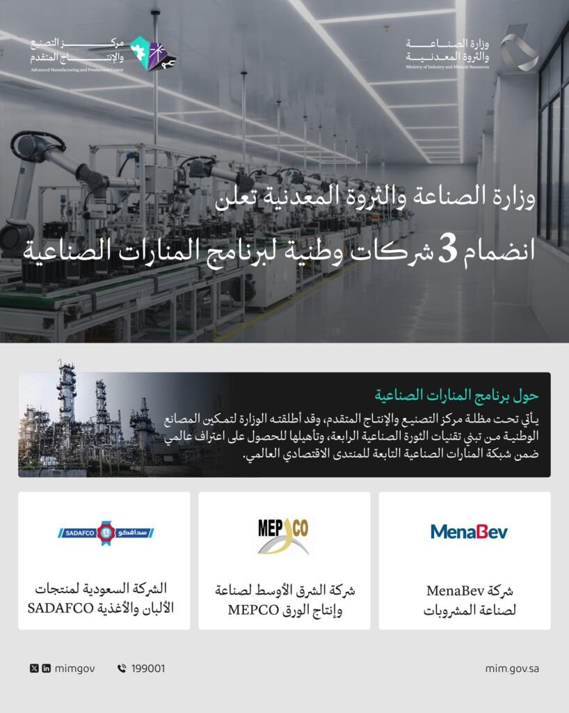 أعلنت وزارة الصناعة والثروة المعدنية عن انضمام ثلاث شركات وطنية رائدة إلى برنامج المنارات الصناعية التابع لمركز التصنيع والإنتاج المتقدم، والذي يستهدف تمكين المصانع الوطنية من تبني تقنيات الثورة الصناعية الرابعة، وتأهيلها للحصول على اعتراف عالمي ضمن شبكة المنارات الصناعية التابعة للمنتدى الاقتصادي العالمي، في إطار جهود الوزارة المستمرة لتمكين التحول الصناعي بالمملكة، وتسريع تبني تقنيات التصنيع المتقدم في المنشآت الصناعية الوطنية.