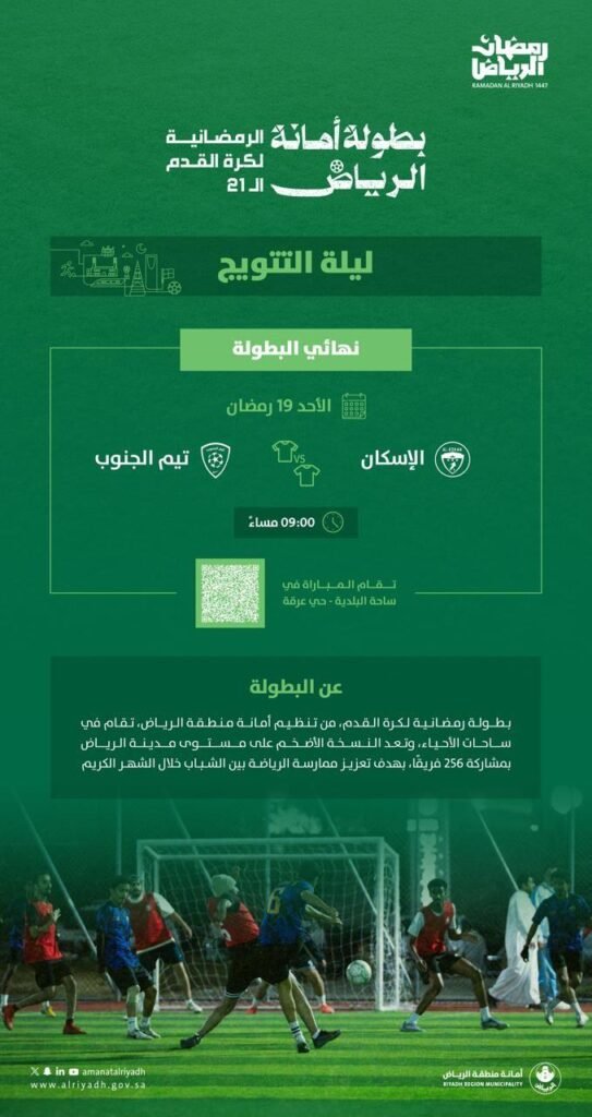 أعلنت أمانة منطقة الرياض عن المواجهة المرتقبة لنهائي بطولة أمانة الرياض الرمضانية لكرة القدم في نسختها الـ(21)، ضمن فعاليات “رمضان الرياض”، وذلك بين الفرق التي تأهلت إلى النهائي من مختلف قطاعات العاصمة بعد مراحل تنافسية شهدت مشاركة واسعة من فرق الأحياء.