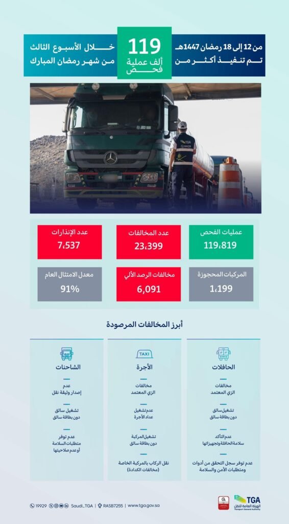 نفَّذت الهيئة العامة للنقل خلال الفترة 12 – 18 من شهر رمضان الجاري أكثر من 119,819 عملية فحص نتج عنها رصد 23,399 مخالفة، كما جرى حجز 1,199 مركبة مخالفة، في عددٍ من مناطق المملكة وتحديدًا في منطقتي مكة المكرمة والمدينة المنورة؛ لضمان تقديم خدمات نقل آمنة وذات جودة عالية لضيوف الرحمن والمستفيدين.