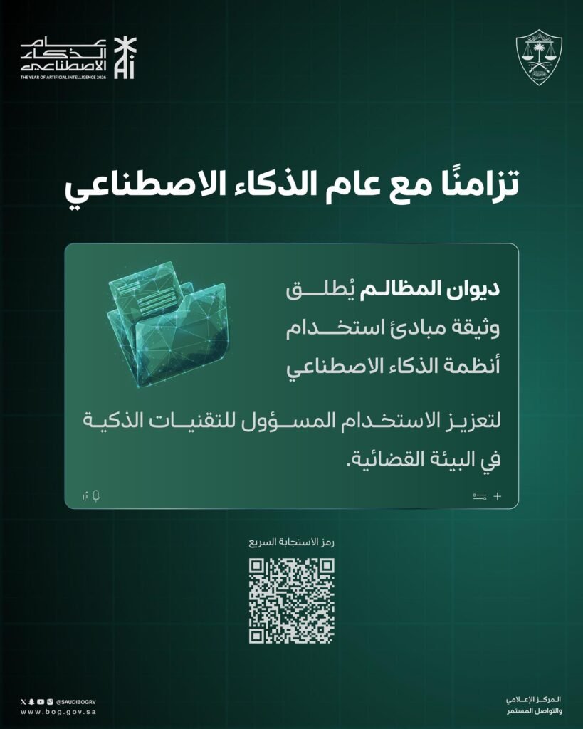 وجَّه معالي رئيس ديوان المظالم رئيس مجلس القضاء الإداري الدكتور علي بن أحمد الأحيدب بإطلاق وثيقة مبادئ استخدام أنظمة الذكاء الاصطناعي بديوان المظالم، تزامنًا مع موافقة مجلس الوزراء على تسمية عام 2026م عامًا للذكاء الاصطناعي، وذلك في إطار توجه ديوان المظالم لتعزيز توظيف التقنيات الحديثة في دعم كفاءة أعمال القضاء الإداري وترسيخ مبادئ الاستخدام المسؤول للتقنيات الذكية.