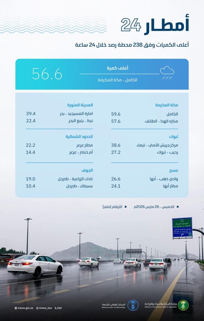 شهدت 11 منطقة في المملكة خلال الأربع والعشرين ساعة الماضية هطول أمطار تراوحت بين الغزيرة والخفيفة، حيث سجّلت محطة رصد الكامل بمنطقة مكة المكرمة أعلى كمية بلغت 59.6 ملم، فيما سجلت محطة منتزه الهدا بالطائف 57.6 ملم، ومحطة الشفا بالطائف 44.3 ملم، في حين سجلت محطة الريان بالجموم 42.8 ملم، ومحطة إمارة المسيجيد بمحافظة بدر في المدينة المنورة 39.4 ملم.