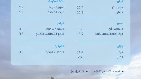 سجّلت منطقة نجران أعلى كمية لهطول الأمطار بـ 27,4 ملم في قرية حمى بمحافظة ثار، و12,5 ملم في خباش. فيما سجّلت عسير 15,8 ملم في الشعف…