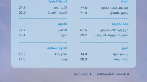 شهدت جميع مناطق المملكة خلال الأربع وعشرين ساعة الماضية، هطول أمطارٍ متفرقة، وسجّلت منطقة الباحة أعلى معدلٍ لكميات هطول الأمطار بـ77,8 في جرداء بني علي بمحافظة…