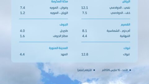 شهدت 7 مناطق بالمملكة خلال الساعات الأربع والعشرين الماضية هطول أمطار بكميات متفاوتة ومتفرقة، حيث سجّلت محطة رصد الفارعة بالوجه بمنطقة تبوك أعلى كمية بـ13.2 ملم، فيما سجّلت…