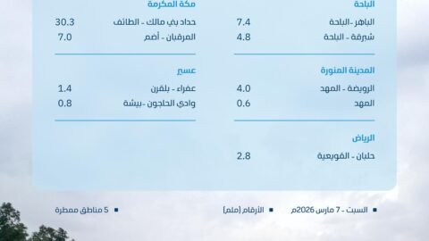 رصدت وزارة البيئة والمياه والزراعة هطول أمطار في (5) مناطق، تصدرتها منطقة مكة المكرمة بتسجيل أعلى معدل كميات بلغت (47) ملم في مركز القريع بني مالك – ميسان.…
